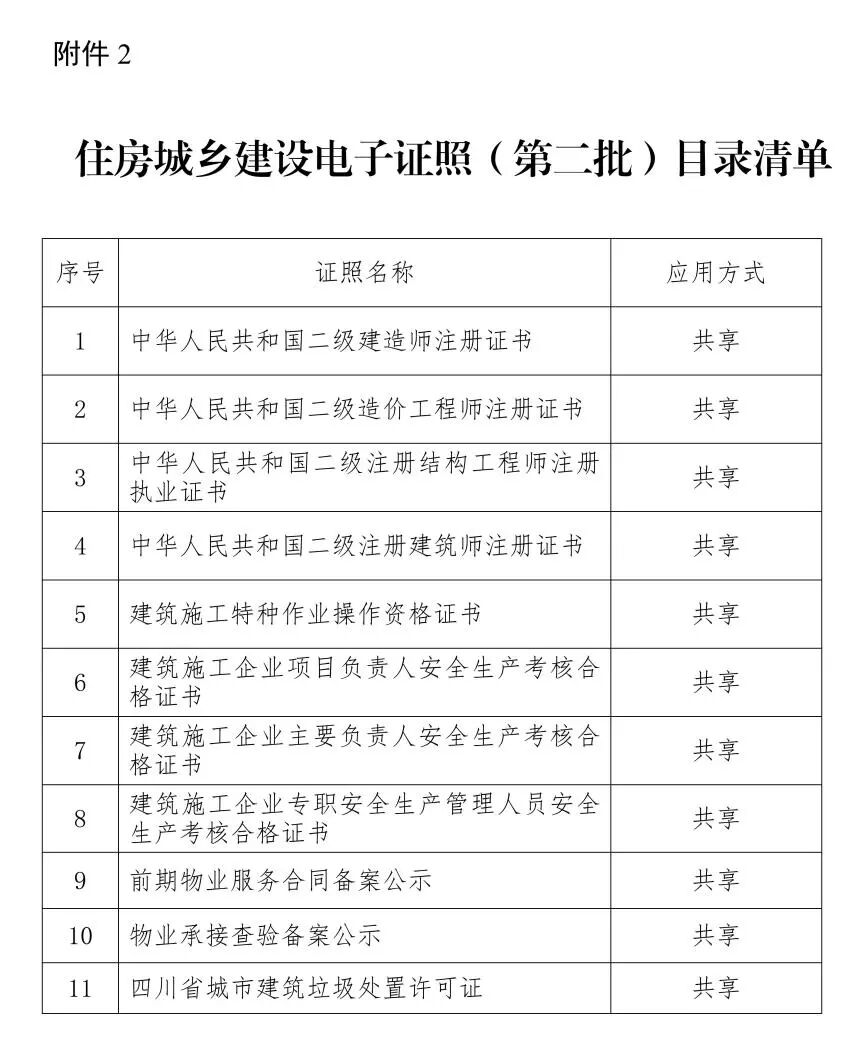本次共启用中华人民共和国二级建造师注册证书、中华人民共和国二级造价工程师注册证书、中华人民共和国二级注册结构工程师注册执业证书、中华人民共和国二级注册建筑师注册证书、建筑施工特种作业操作资格证书、建筑施工企业项目负责人安全生产考核合格证书、建筑施工企业主要负责人安全生产考核合格证书、建筑施工企业专职安全生产管理人员安全生产考核合格证书、前期物业服务合同备案公示、物业承接查验备案公示和四川省城市建筑垃圾处置许可证等11类电子证照。